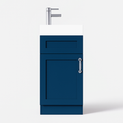 The 400mm Navy Blue Vanity Unit adds sophistication and bold character to small bathrooms. Its deep shade contrasts with lighter tiles and walls, making the unit a standout feature. It's 400mm wide and compact, making it ideal for cloakrooms or en-suites where space is limited. This vanity is made of lacquered moisture-resistant MDF and features a premium ceramic basin. It is both stylish and durable. The navy blue finish adds a sophisticated touch, complementing gold, brass or chrome fixtures for a striking bathroom design.