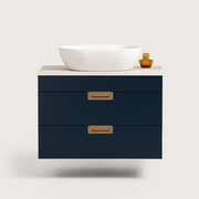The rich navy blue finish provides a confident character and a hint of nautical sophistication, and is a refreshing alternative to plain white. It is versatile and stylish, pairing beautifully with brass handles for a luxe statement, chrome for a sharp modern look, or against clean and crisp tiles for timeless contrast. Complemented with the countertop basin, this vanity combines the high-end hotel experience with the functional requirements of daily use, elevating any modern bathroom project.